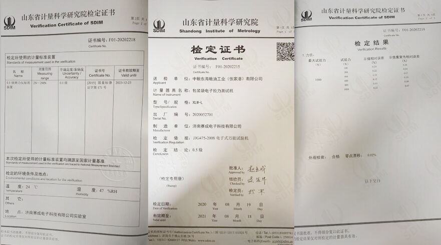 為了更好的交付這批設備,確保設備測試數據的準確性,濟南賽成儀器向山東省計量科學研究院提出了檢定申請。依據JJG475-2008電子式萬能試驗機的檢定規程,省計量院工作人員對XLW-L包裝袋電子拉力試驗機的精度和誤差等進行了檢定,經檢定結論達到0.5級,檢定結果合格。2020年8月9日獲得山東省計量科學研究院頒發的檢定證書,獲得的這份檢定證書,進一步證明了濟南賽成儀器符合預定要求和質量要求,測量結果準確,儀器持續可靠,性能穩定。